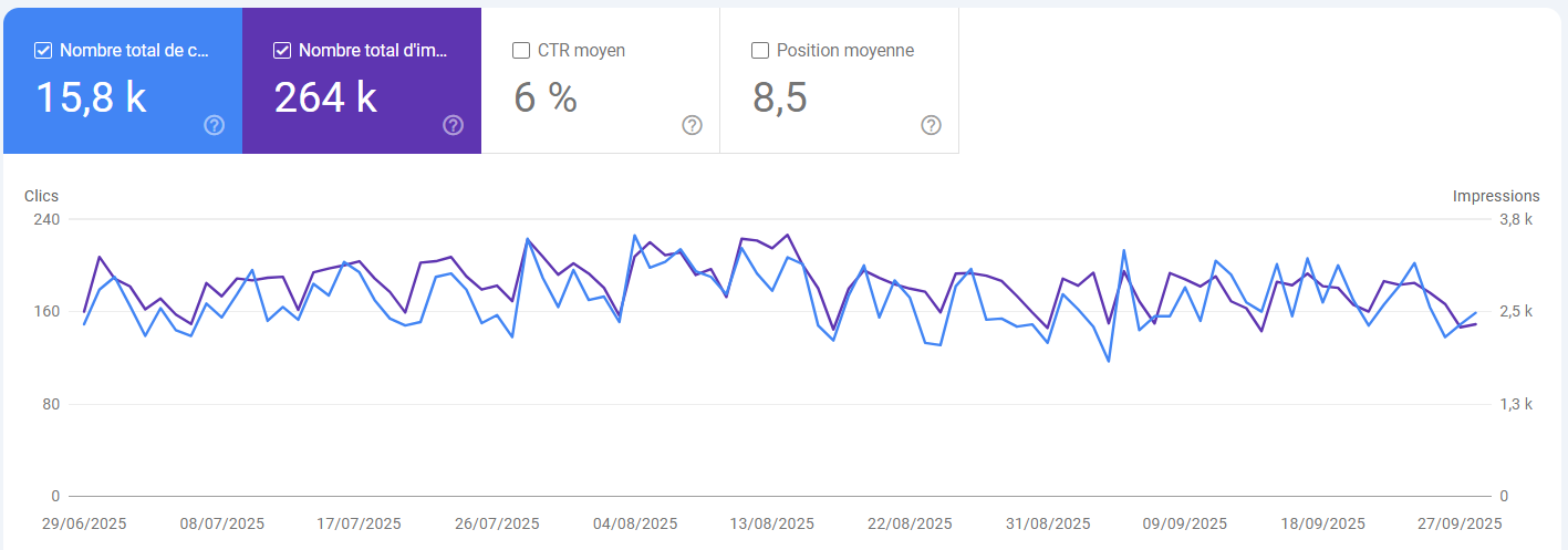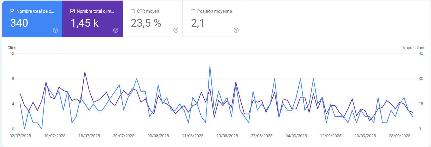 L’une des plus grandes victoires dans cette étude de cas se lit directement dans les données de Google Search Console (GSC), l’outil d’analyse de la performance de recherche de Google. En analysant les données des trois derniers mois, soit du 01/07/2025 au 30/09/2025, la capture d’écran ci-dessous (Fournie par vous) illustre parfaitement l’efficacité de nos efforts