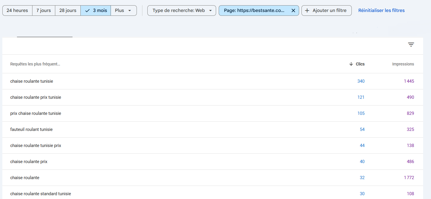 • La requête la plus fréquente, « chaise roulante tunisie », a généré à elle seule 361 clics et se positionne à une moyenne impressionnante de 2,1. Être classé en 2ᵉ position sur un terme générique et concurrentiel est une performance exceptionnelle, assurant un flux de trafic constant et qualifié.